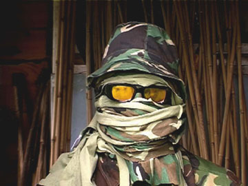 Gallery Boreas 2005-12-01 Fresh from a run at last summer’s Venice Biennial, Welsh artist Peter Finnemore’s selection of video works delve into contemporary and ancient mythical realms. Focusing on himself, and a cast of Key-Stone Cop survivalists, all clad in baggy camo uniforms and jammin’ to generic Latin disco, he riffs on urban legends of secret military training in psychic powers and invisibility. Another tack is “Green Man,” a pre-Christian Celtic “Father Nature,” all herb and shrubbery. However Finnemore’s “Green Man” is from the “green room” and seems more at home within the video jungle, hamming it up for the cameras, tweaking video levels with reflected light, fast and reverse action scenes, and mischievous narratives. Imagine malevolent gnomes with vidicams and trickster attitudes.