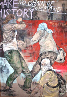 Ad Hoc Art 2008-07-01 The Poets of Paste make work with muscle. Their silk-screened, sawed, glued, nailed, painted, printed pieces jostle the walls of Adhoc with the charge of top shelf street art. Powerful figures, alternately lyrical, political, rhapsodic, often on a physically grand scale, convey an artistic heat that would make Leon Golub, Robbie Conal, Swoon and other Godparents of this form very proud. Purveyors of emotive bodies in the public realm tend to share a knack for drama and this crew is no exception. There is material subtlety here – in the way a sheet of rice paper is applied to a panel of wood or a grouping of paper cutouts is arranged in a cardboard box – but the goal is intensity, art meant to stop you in your tracks and you’ll want to do that over and over at this show. These four poets get dirty when they work, and their labor has made for some very passionate poetry.